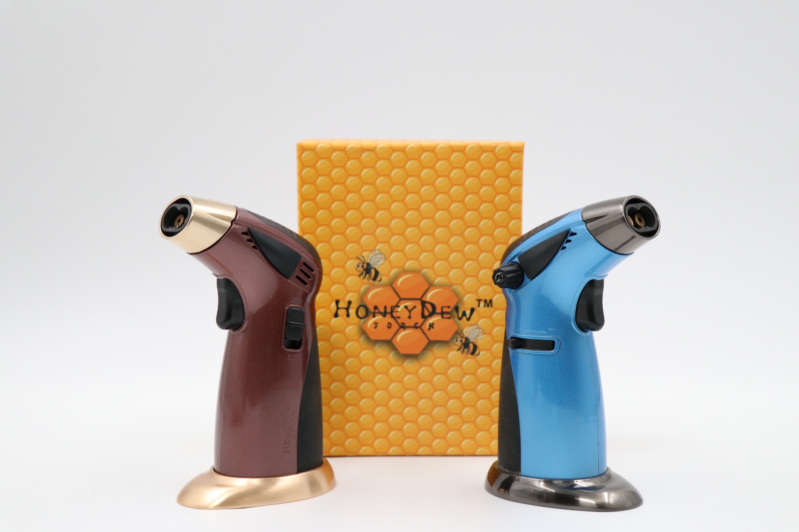 The HoneyDew 1509 Refillable Butane Torch combines a sleek, modern design with reliable performance. Featuring a metallic bronze finish with gold accents, this model stands out as a premium option for both tobacco accessories and culinary use. Its ergonomic curved grip, sturdy base, and adjustable jet flame make it as practical as it is stylish. Each unit is packaged in a custom HoneyDew gift box, ensuring strong shelf appeal and retail value.