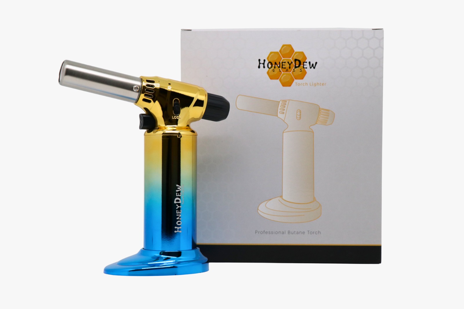 The HoneyDew AS-103 Refillable Butane Torch is a step up in size and power from the AS-102, built for customers who want a larger, more robust flame tool. With its sleek body and stable base, the AS-103 delivers precision performance for tobacco accessories, culinary tasks, and general household use. Available in five eye-catching colors — Gold, Red, Grey, Silver, and Blue/Gold Gradient — the AS-103 comes packaged in a retail-ready HoneyDew box for easy merchandising.