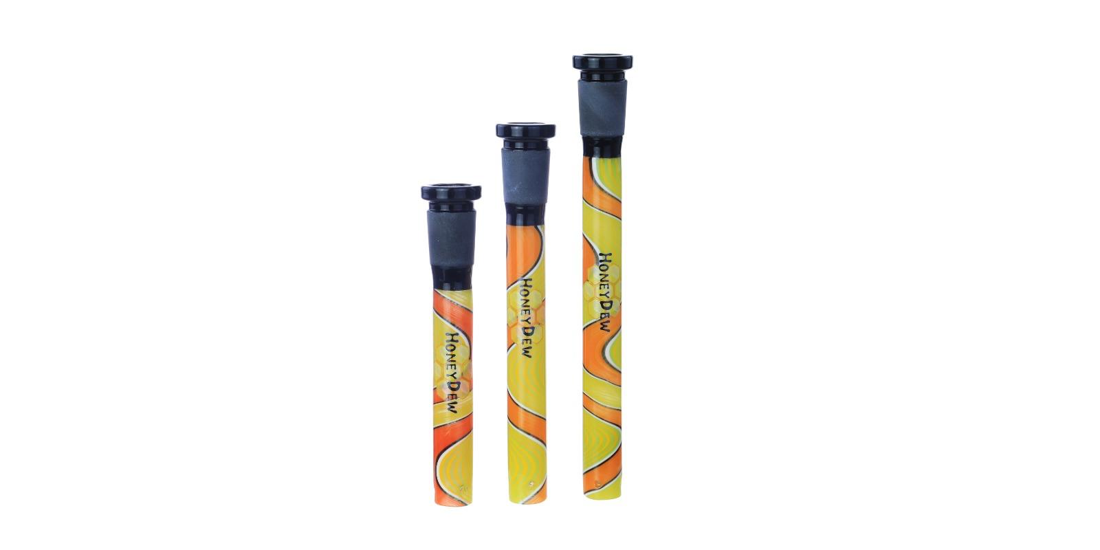 The HoneyDew DS-08 Downstem Set features three essential sizes in a vibrant orange swirl design. Each display includes 6 pieces total – two of each size – packaged in HoneyDew’s signature retail-ready box.