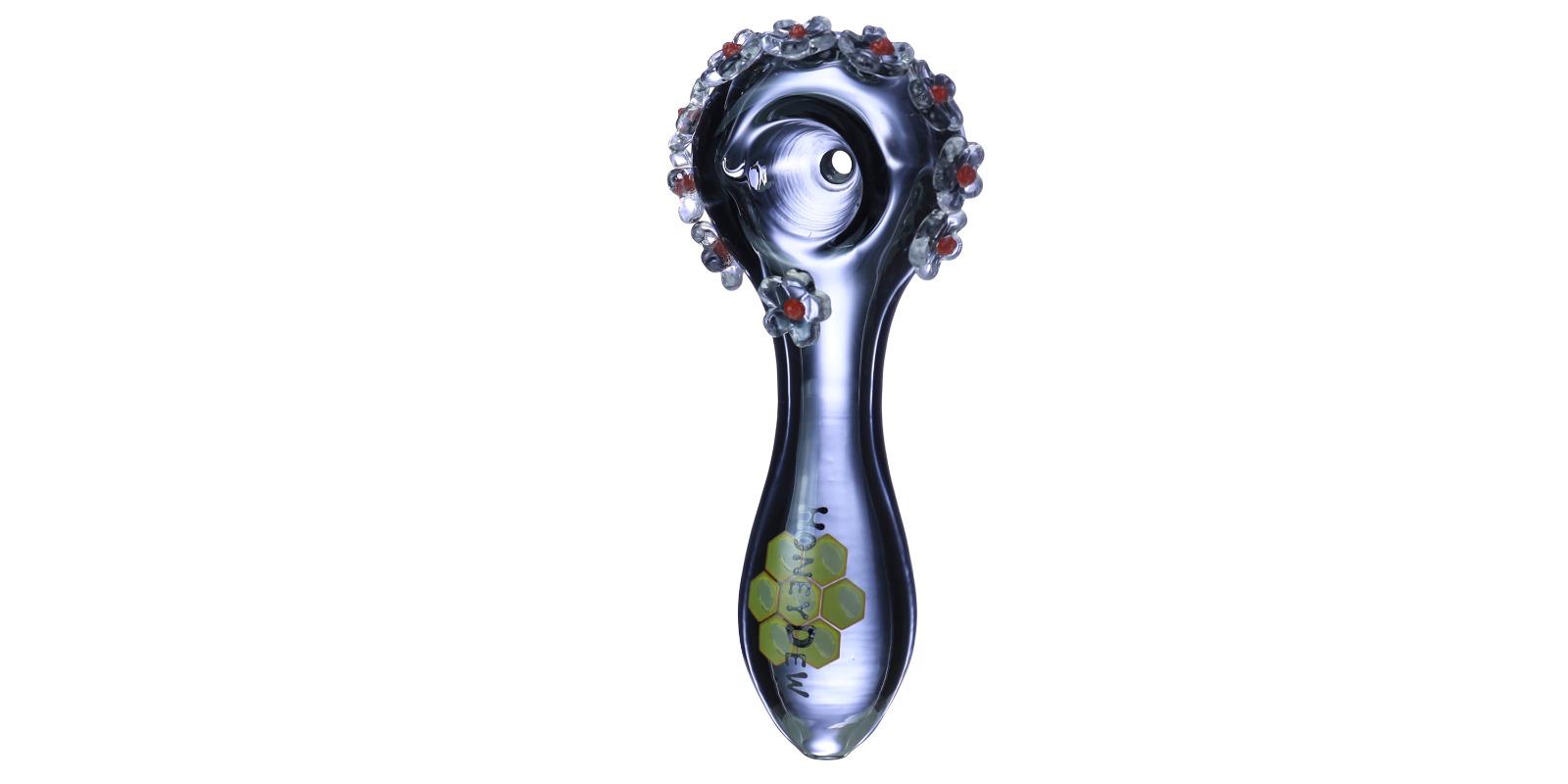 - Design: Spoon-style hand pipe with raised flower accents