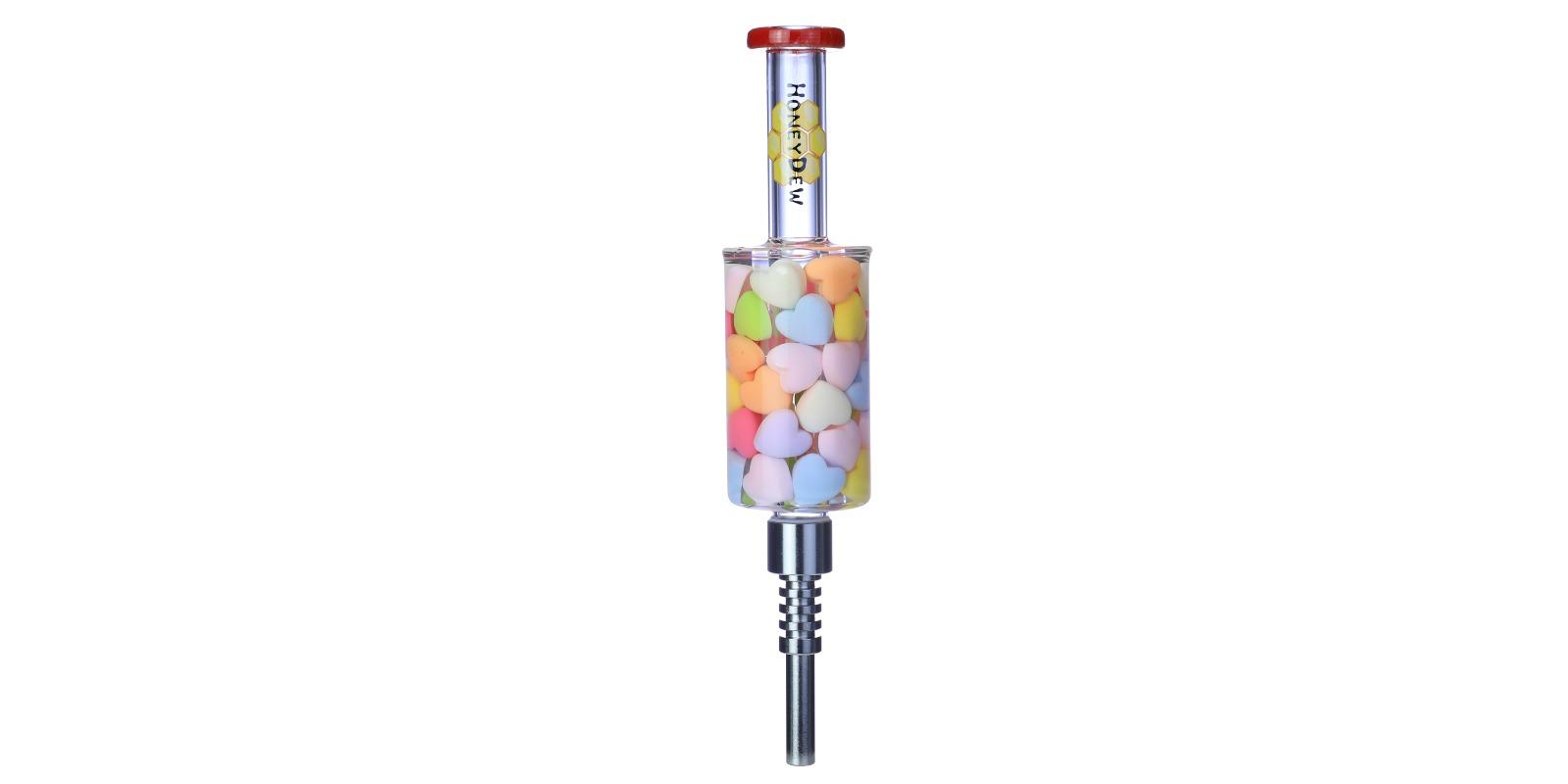 The HoneyDew NC-239 Nectar Collector brings a playful and vibrant twist to dabbing. Featuring a chamber filled with multicolor heart-shaped accents, this collector is as fun as it is functional. Each piece includes a durable titanium tip for smooth performance.