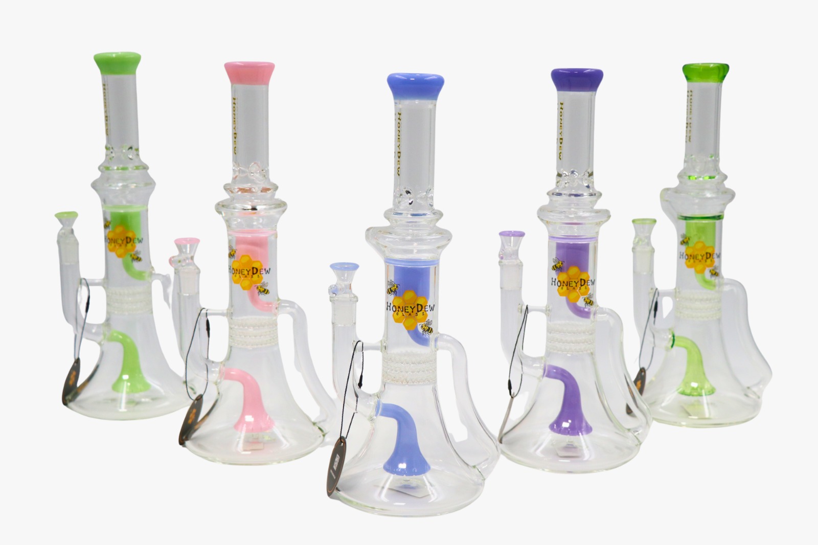 The HoneyDew SI561 is a premium 14″ glass water pipe featuring a 14mm joint and an included glass bowl, designed for advanced users seeking smooth, cool hits with enhanced airflow. Its tall, elegant design offers a standout piece perfect for upscale retail displays.