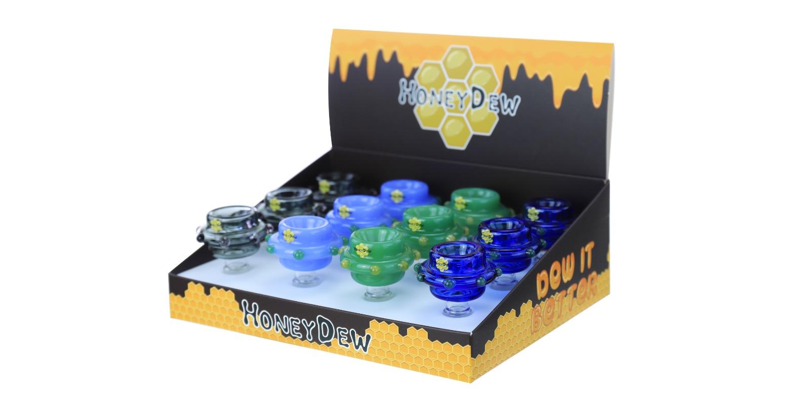 The HoneyDew WPH-870 Glass Bowl is designed with decorative glass marbles around the rim for a stylish, functional grip. Perfect for 14mm water pipes, these bowls combine durability, function, and eye-catching colors. Each display comes with 12 assorted pieces, packed in HoneyDew’s signature retail-ready display box.